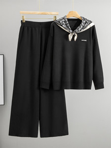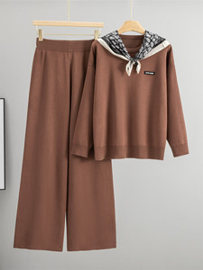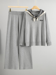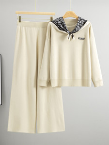 跨境毛衣秋冬百搭慵懒风圆领长袖宽松针织上衣高腰阔腿裤两件套女