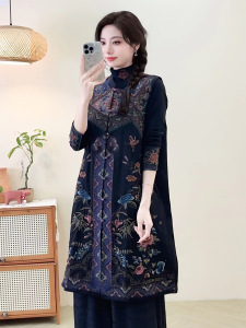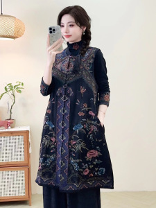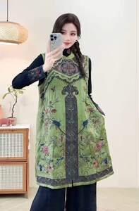 重工刺绣2025秋款女式缎面长款民族风刺绣带女士马甲中式坎肩