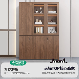 【升级E0级环保板】【包送装】3门玻璃文件柜灯带款(非洲胡桃+铁灰)