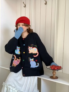 可爱猫咪贴布绣开衫毛衣女2025宽松韩系慵懒风chic外套