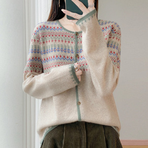 100丝光羊毛针织开衫女式圆领外套秋冬新款文艺复古风提花毛衣潮