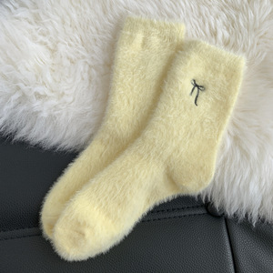 秋冬款彩色蝴蝶结刺绣女袜加绒加厚保暖袜居家地板中筒袜睡眠袜子