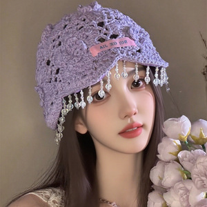 波西米亚风串珠流苏包头帽女2025新款镂空钩花时尚百搭显脸小帽子