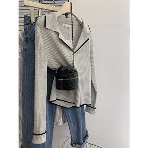 灰色polo领针织衫女早秋秋季内搭打底衫v领长袖针织上衣毛衣秋冬