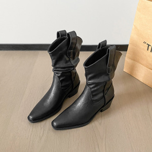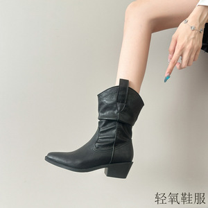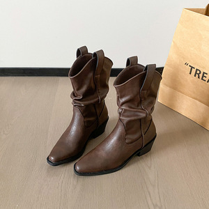 棕色中筒骑士机车靴子女高跟西部牛仔靴粗跟套筒马丁靴短靴秋冬
