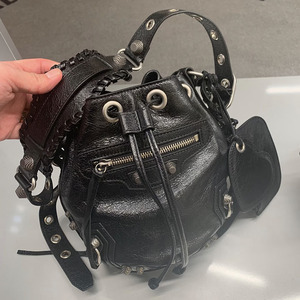2025新款褶皱牛皮抽绳水桶包三合一铆钉机车包时尚潮流单肩斜挎包