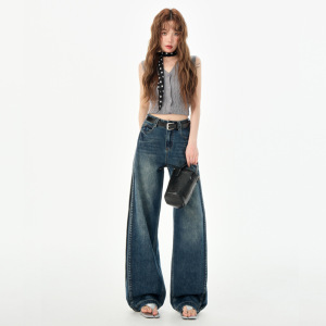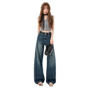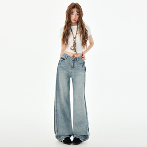复古阔腿牛仔裤女2025年高腰显瘦宽松休闲垂感直筒裤拼接设计时髦