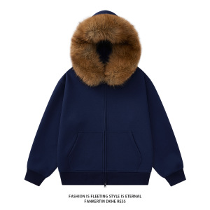 外贸跨境批发2025重磅美式复古连帽可拆卸毛领拉链开衫外套座山雕