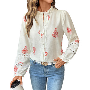 欧洲跨境外贸2025新款秋季上衣单排扣开衫立领民族风印花衬衫女