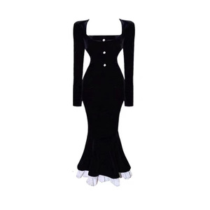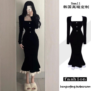 入秋年会穿搭高端收腰鱼尾裙荷叶边修身包臀后妈复古丝绒连衣裙女