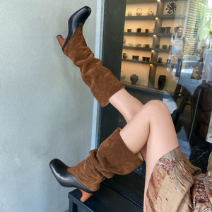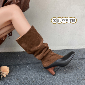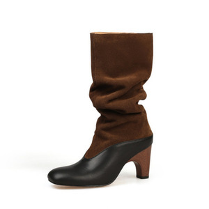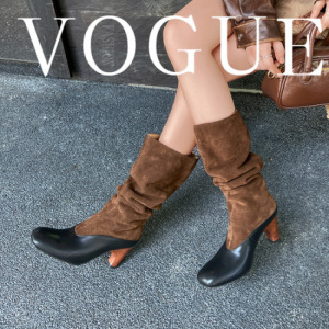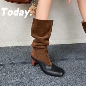 2025秋冬真皮女鞋小众设计拼色高跟直筒时装靴小腿中高筒粗跟女靴