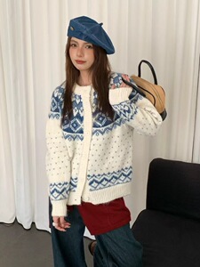 氛围感复古提花费尔岛毛衣开衫女秋冬季新款宽松慵懒风针织衫外套
