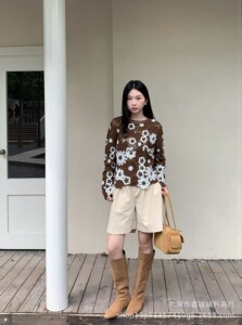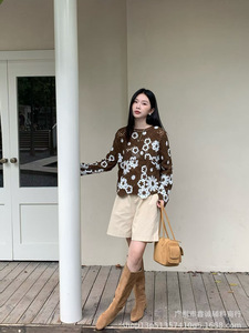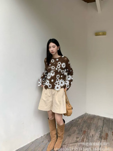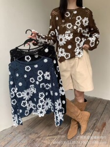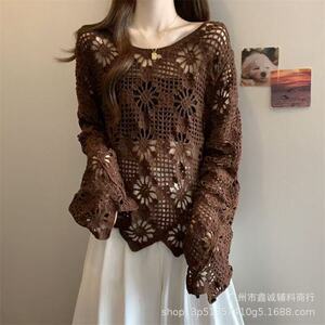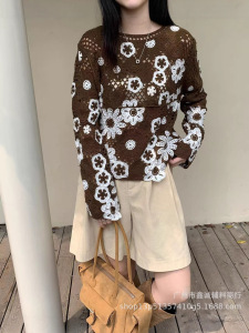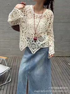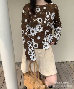 早秋新款设计感镂空钩花拼色花朵长袖针织衫上衣宽松显瘦百搭罩衫
