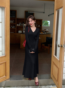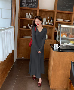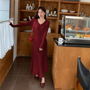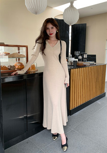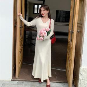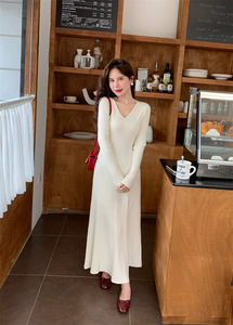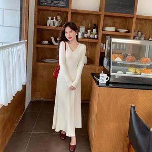 米白色V领坑条针织连衣裙秋冬新款气质修身显瘦大衣内搭打底长裙