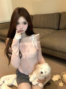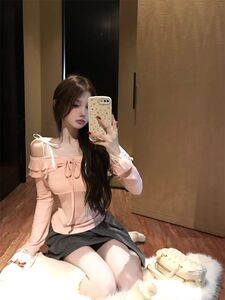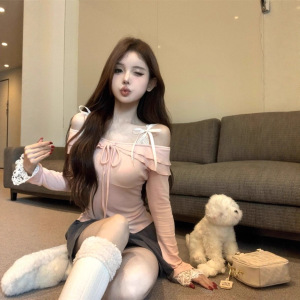 辣妹一字肩内搭粉色T恤女早春季上衣设计感蕾丝拼接露肩长袖上衣