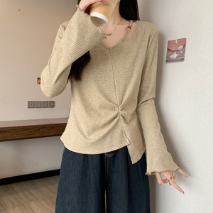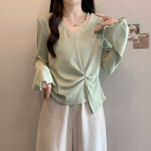 实拍2025秋装新款胖mm大码捏褶V领T恤设计感不规则显瘦上衣80272