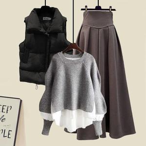 秋冬穿搭女2025新款大码宽松假两件毛衣百搭马甲显瘦半身裙三件套