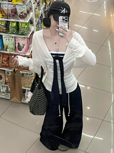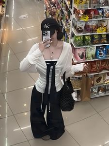 辣妹早秋套装女2025新款绑带条纹抹胸上衣搭配长袖防晒罩衫两件套