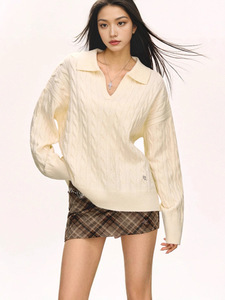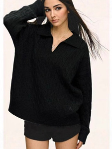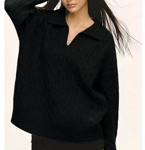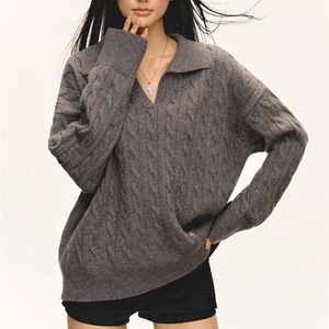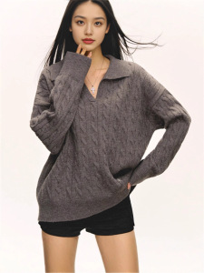 欧美跨境翻领绞花套头毛衣女秋冬新款亚马逊宽松慵懒风针织衫上衣
