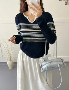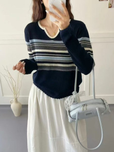 2025秋季新款羊毛衫条纹u领打底衫针织毛衣长袖薄款高品质上衣女