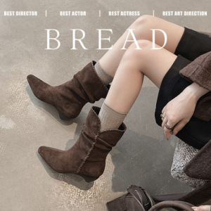 韩版单靴磨砂绒面堆堆靴女2025新款粗跟尖头西部牛仔靴短靴子