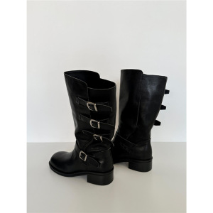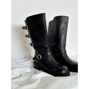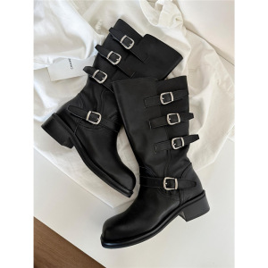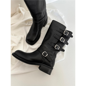 牛皮版~复古英伦皮带扣西部牛仔靴中筒骑士靴显瘦短靴粗跟马丁靴