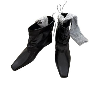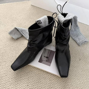 牛皮版~小众真皮方头粗跟宽筒短靴女英伦风马丁靴套筒显瘦单靴潮