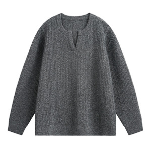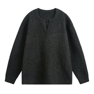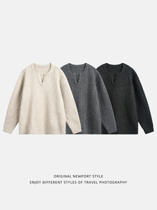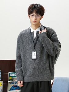复古绞花肌理小V领毛衣男秋冬款慵懒宽松套头针织衫纯色线衣外套