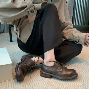 羊皮版~新款百搭真皮通勤小皮鞋女粗跟系带英伦风乐福鞋深口单鞋