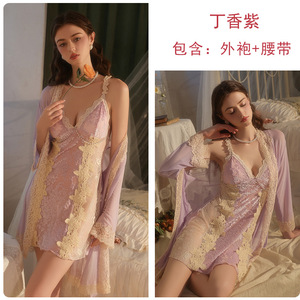 瑰若品牌内衣激情深V加胸垫纯欲慵懒丝绒睡裙外袍家居服套装5911