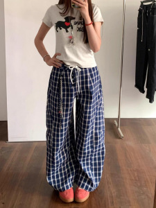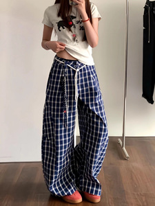 美式复古蓝色格纹慵懒风阔腿裤男女新款宽松显瘦百搭休闲裤长裤潮
