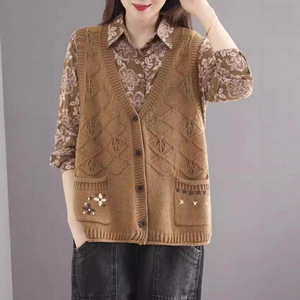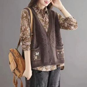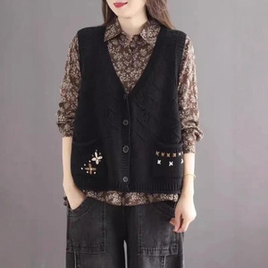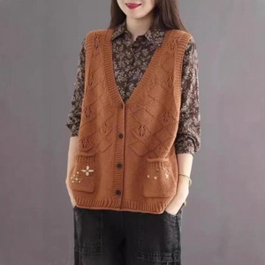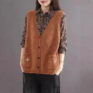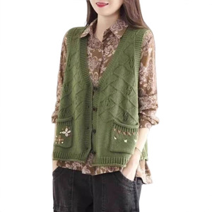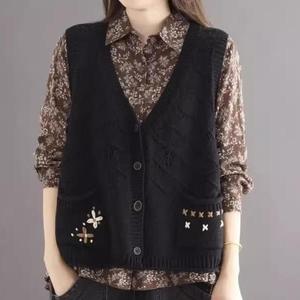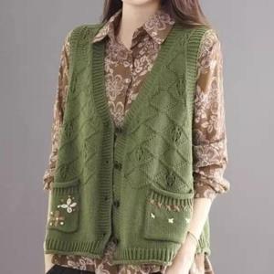 文艺复古镂空绣花针织马甲女春秋新款宽松无袖背心坎肩开衫外套