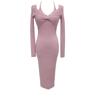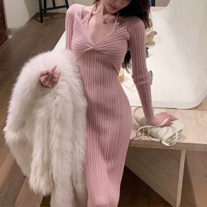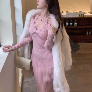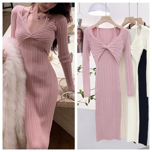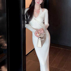 8148 白色假两件连衣裙秋冬季纯欲V领挂脖扭结露肩包臀中长款裙子