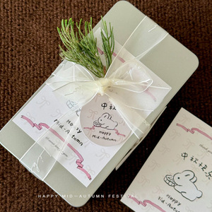银色马口铁空盒+中秋米白色纹路兔子吊牌+英文蕾丝丝带+装饰绿植+中秋纹路兔子卡片一个约18*9.8