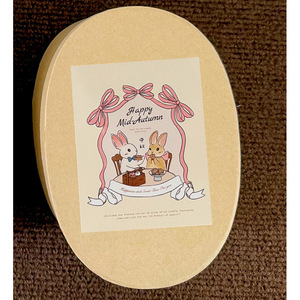 牛皮纸色椭圆硬盒空盒+手绘两只兔子插画卡片一个约长18.5宽13高7. 5cm