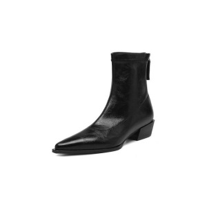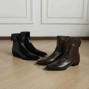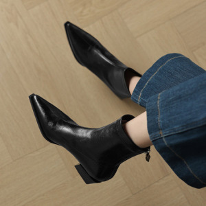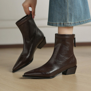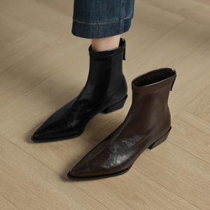 尖头粗跟后拉链短靴女2025新款秋冬季真皮显瘦英伦风马丁靴