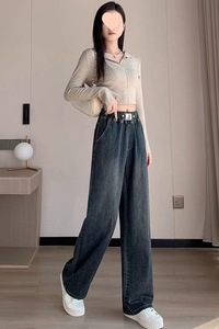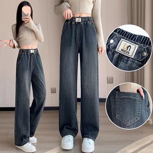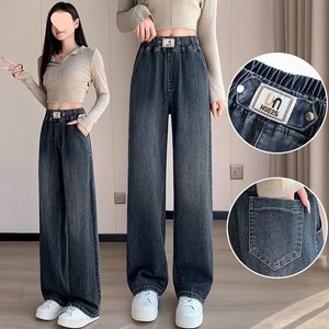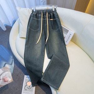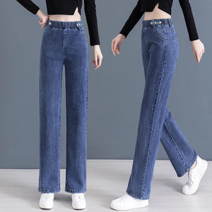 春秋新款弹力牛仔裤女松紧高腰宽松显瘦时尚百搭少女感直筒裤