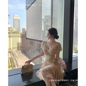 温柔风气质领短袖连衣裙女夏季2025新款百搭修身显瘦休闲字短裙