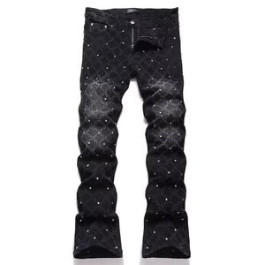 高街新款黑色男士满钻牛仔裤破洞小脚弹力微喇潮流修身裤子休闲裤