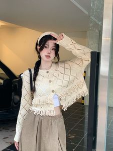 早春季新款小个子短款上衣镂空流苏长袖针织衫薄款毛衣开衫外套女