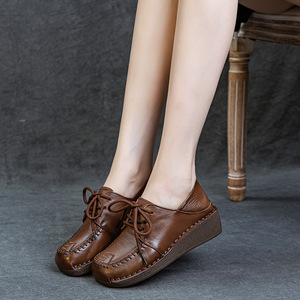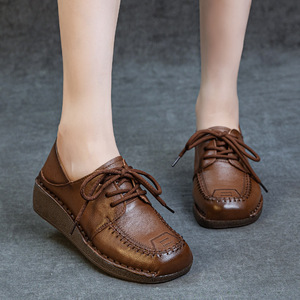 2025秋季新款真皮女式单鞋坡跟手工缝制深口鞋头层牛皮前系带鞋子