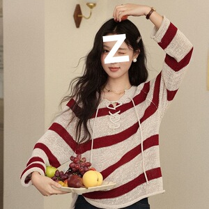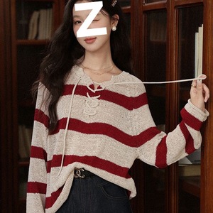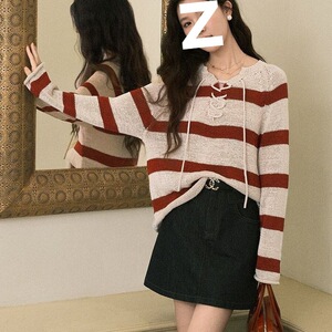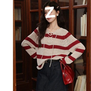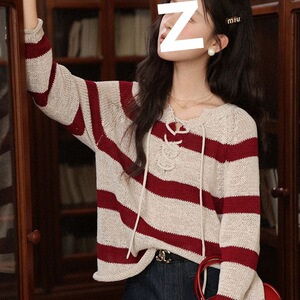 复古元素红色条纹长袖毛针织衫早秋新款慵懒宽松套头上衣女