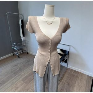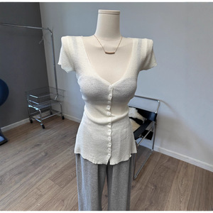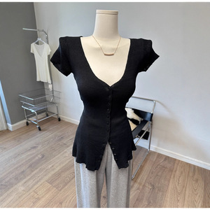 现货 东大门大V领单排扣短袖针织衫修身打底衫上衣秋季