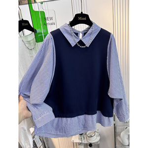 秋装新款条纹长袖拼接假两件衬衫上衣爆款时尚洋气欧货衬衣女