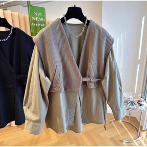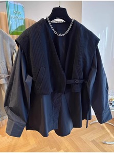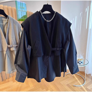 小众设计针织马甲拼接V领长袖衬衫女早秋大码宽松休闲假两件上衣