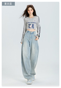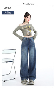 2025秋新款深色特色后袋高腰弯刀阔腿牛仔裤女显瘦直筒宽松拖地裤