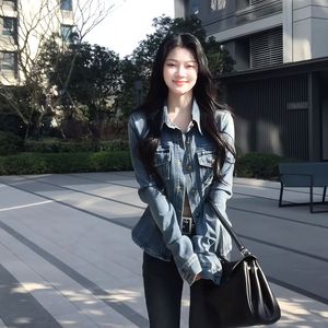 2025复古蓝色POLO修身弹性衬衫新款牛仔早秋款感收外套显瘦上衣女