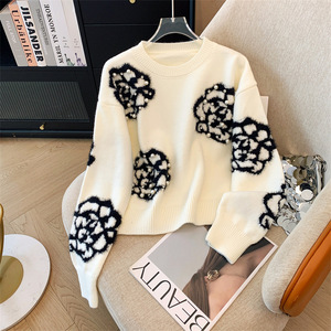 2025秋冬新款潮流圆领钉珠针织毛衣女宽松提花山茶花套头上衣
