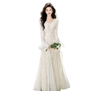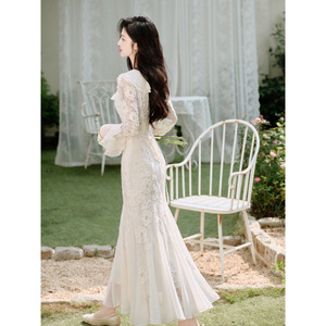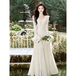法式重工刺绣亮片蕾丝雪纺连衣裙女神范气质度假长裙白色礼服结婚