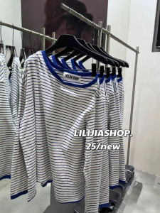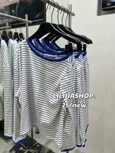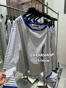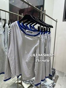 32支纯棉平纹拉架色织条 早秋宽松撞色条纹斜肩露肩长袖T恤女上衣